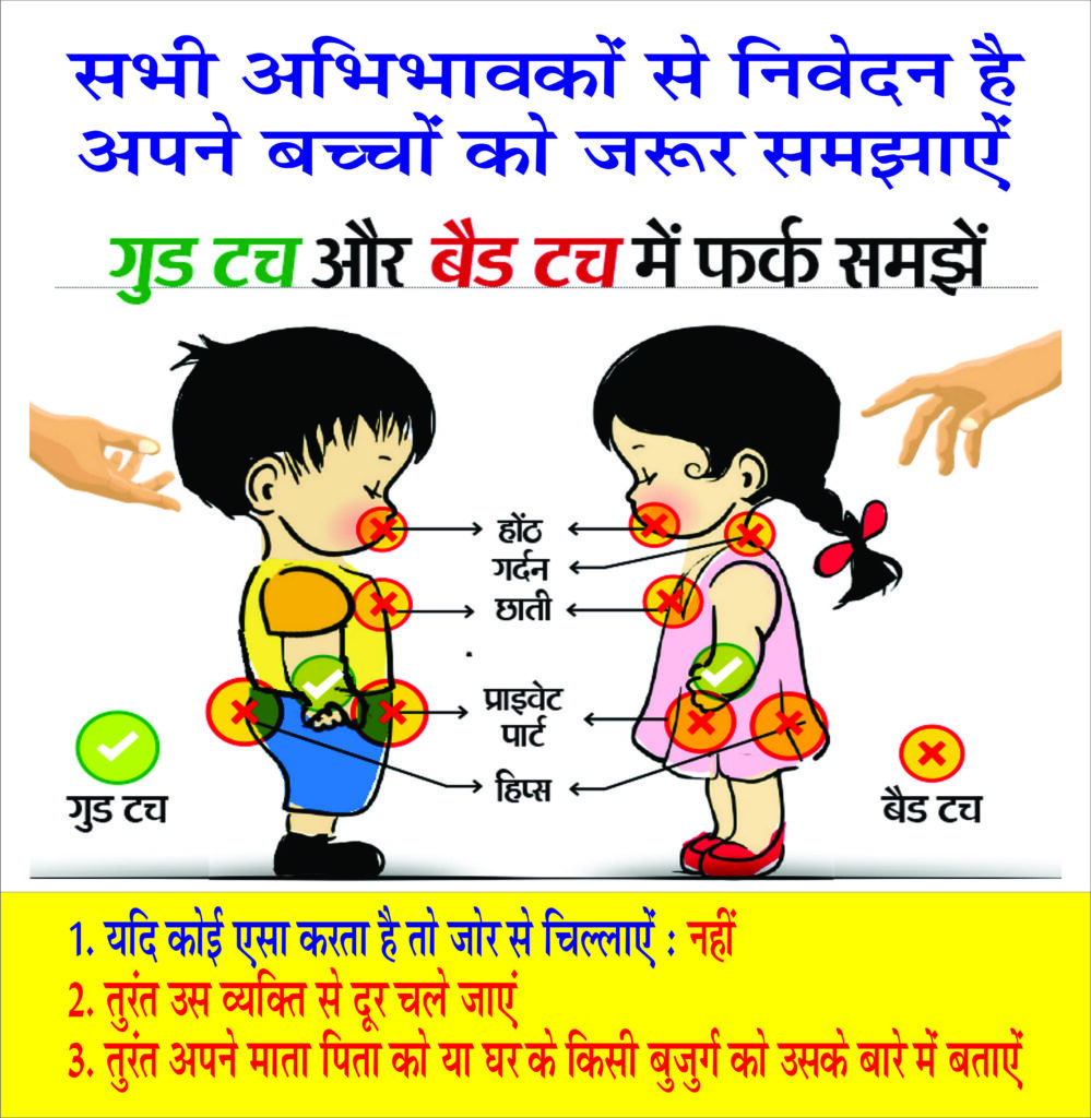आज प्रदेश के 66 लाख स्कूली छात्र-छात्राओं को गुड टच बेड टच अभियान के तहत यौन दुर्व्यवहार से संबंधित जानकारी दी गयी . इसके लिए प्रदेश के सभी सरकारी विद्यालयों में “गुड टच बेड टच” की जानकारी के लिए सेशन चला . इस अभियान के तहत बनाया गया 5 मिनट का एक वीडियो दिखाया गया साथ ही सरकारी विद्यालयों में स्लोगन और पोस्टर चस्पा किए गए .