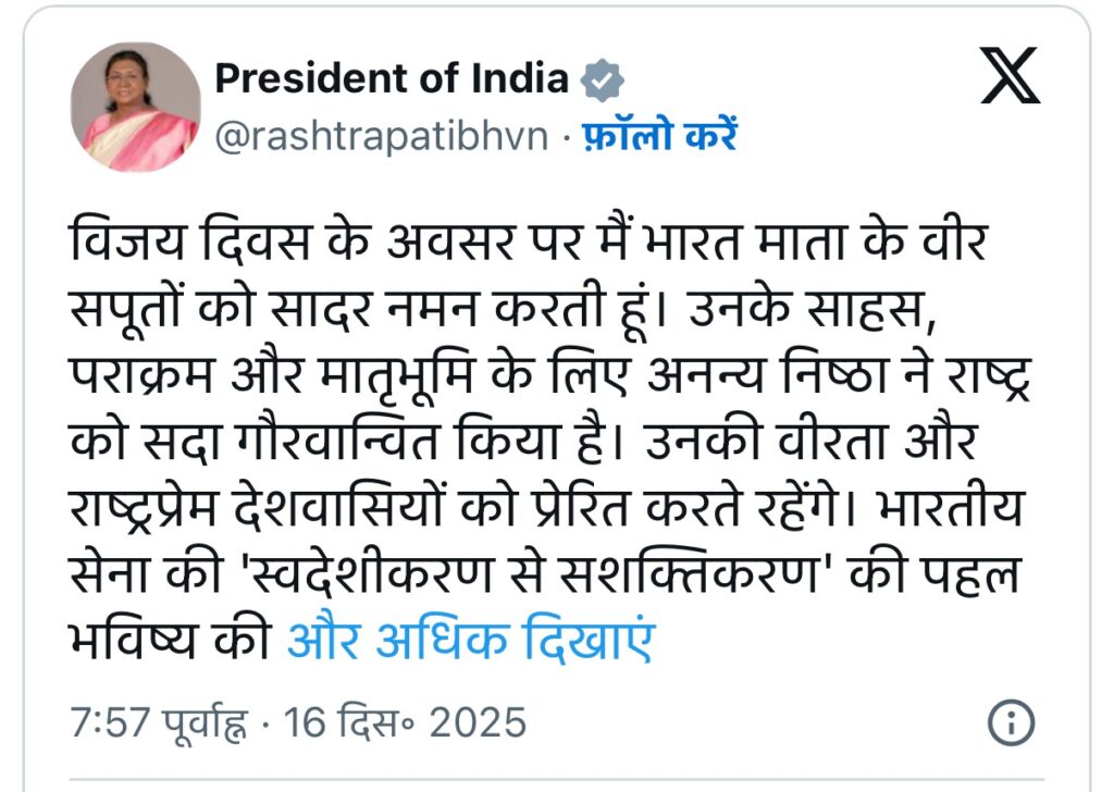 राष्ट्रपति द्रौपदी मुर्मू ने सोशल मीडिया प्लेटफॉर्म एक्स पर अपने संदेश में कहा कि विजय दिवस पर वह भारत माता के वीर सपूतों को नमन करती हैं। उन्होंने कहा कि सैनिकों का साहस, पराक्रम और मातृभूमि के प्रति निष्ठा देश को सदैव गौरवान्वित करती रहेगी। राष्ट्रपति ने भारतीय सेना की ‘स्वदेशीकरण से सशक्तिकरण’ पहल की सराहना करते हुए कहा कि ऑपरेशन सिंदूर में सेना ने आत्मनिर्भरता, सामरिक मजबूती और आधुनिक युद्ध तकनीक का प्रभावी प्रदर्शन किया है, जो पूरे राष्ट्र के लिए प्रेरणा है।