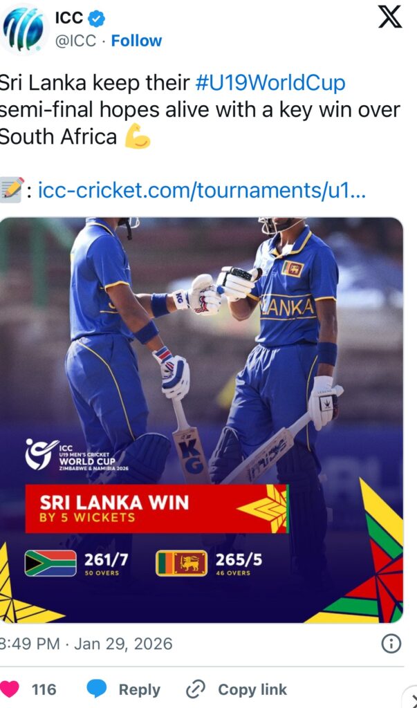 ICC अंडर-19 वर्ल्ड कप 2026 के सुपर सिक्स मुकाबले में श्रीलंका ने साउथ अफ्रीका को पांच विकेट से हराकर सेमीफाइनल की दौड़ में खुद को मजबूत स्थिति में पहुंचा दिया है। बुलावायो में खेले गए इस मुकाबले में पहले बल्लेबाजी करते हुए साउथ अफ्रीका ने 7 विकेट पर 261 रन बनाए, जिसे श्रीलंका ने 46 ओवर में हासिल कर लिया।