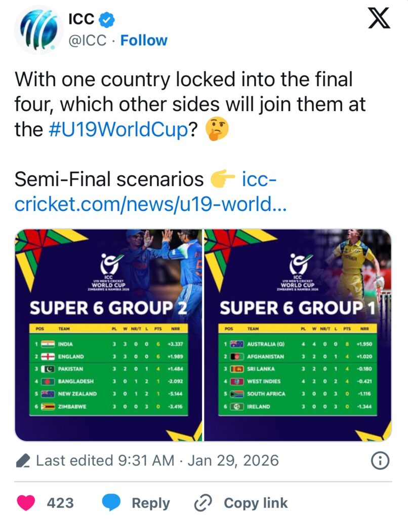 सुपर सिक्स ग्रुप-2 से अभी सेमीफाइनलिस्ट टीमों का फैसला होना बाकी है। इस ग्रुप में तीन मुकाबले शेष हैं, जिनमें भारत और पाकिस्तान के बीच होने वाला हाई-वोल्टेज मैच सबसे ज्यादा चर्चा में है। दोनों टीमों की नजर सेमीफाइनल में जगह बनाने पर टिकी हुई है।
