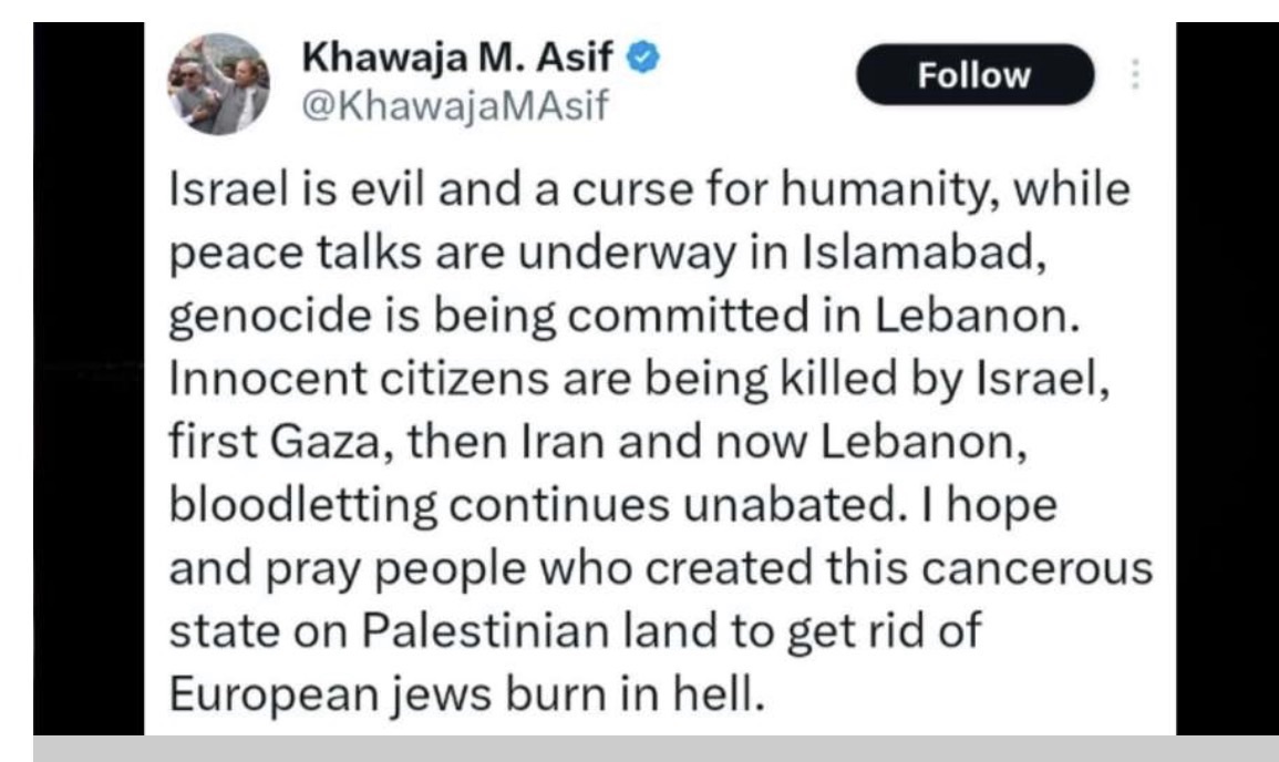 जानकारी के मुताबिक, वार्ता से पहले इस्लामाबाद में सुरक्षा व्यवस्था बेहद कड़ी कर दी गई है। जिस सेरेना होटल में दोनों देशों के प्रतिनिधि मिलने वाले हैं, वहां कर्फ्यू जैसे हालात देखे जा रहे हैं। इसी बीच ख्वाजा आसिफ ने X पर इजरायल को लेकर बेहद तीखी टिप्पणी कर दी, जिसमें उन्होंने उसे मानवता के लिए अभिशाप बताया।
